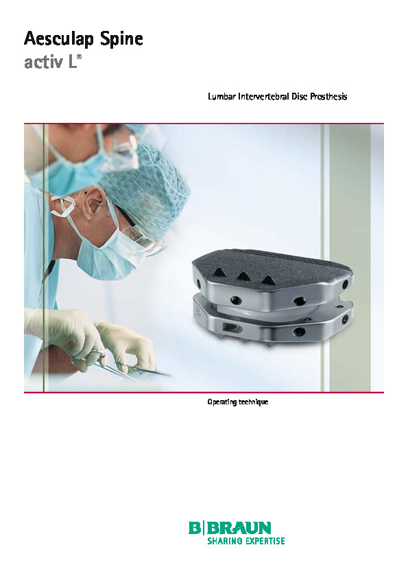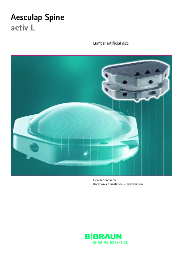 The Activ-L Lumbar artificial disc is a total lumbar disc replacement originally produced by Aesculap and FDA approved for single level disc arthroplasty in 2015. The disc is a 3rd generation disc composed of cobalt-chrome endplates with a titanium plasma sprayed coating along with a calcium-phospate top coating and a ultra high molecular weight polyethylene (UHMWPE) semi-constrained core. The imaplant came as a spike-and-tooth or small keel option for enplate fixation. The polyethylene core locks into the inferior endplate