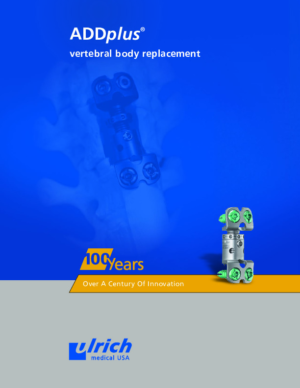 ADDplus by Ulrich Medical USA is a titanium alloy expandable vertebral body replacement implant used for surgical reconstruction of defects of the anterior thoracolumbar spine T1-L5. It is designed with integrated low profile superior and inferior plates for increased stability, and anchored with unique osmium screw technology to provide optimal stabilization. The distal wings of the screw expand 0.7 mm to improve bone purchase and stability once the pin is inserted. Continuous frictionless expansion in situ uses gear driven technology, allowing for easy placement and bridging of the defect. Intended for use with supplemental fixation.