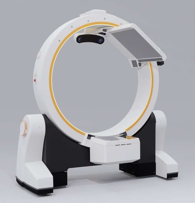 The AIRO TruCT by Stryker is a true intraoperative CT scanner with an image FOV of 51.2cm. The scanner is a mobile unit that employs retractable wheels in the base. When scanning, the wheels retract and gantry rotates 90 degrees. To transport, the wheels extend and gantry rotates in line with the base. The unit has a self-powered driving capability at 1 mph. Can plug into standard outlet for charging.