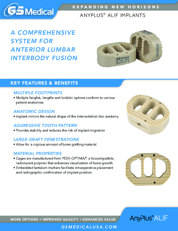 The AnyPlus PEEK ALIF Spacer by GS Medical is a radiolucent PEEK Cage for use in the anterior lumbar interbody fusion procedure. It features serrated teeth to retain the spacer in the disc space and tantalum markers for visualization on imaging.
