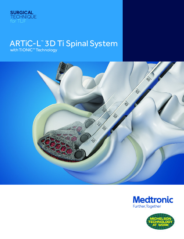 ARTiC -L by Medtronic is a 3D printed titanium curved spacer for use in the TLIF procedure. It utilizes a honeycomb pattern that acts as a osteoconductive scaffold for bony growth into the implant. The implant is then treated using a differentiated laser to produce surface textures increasing bone response (TiONIC).