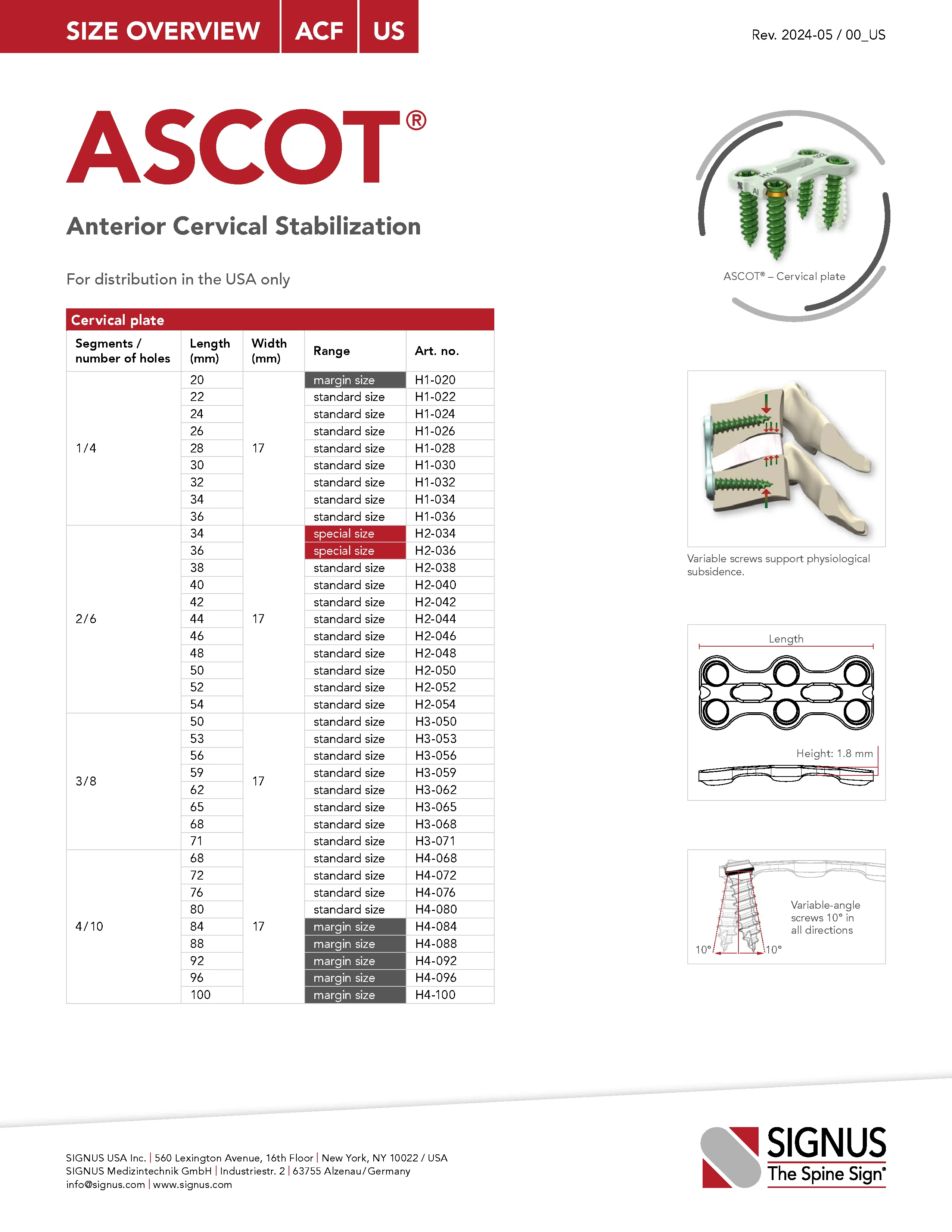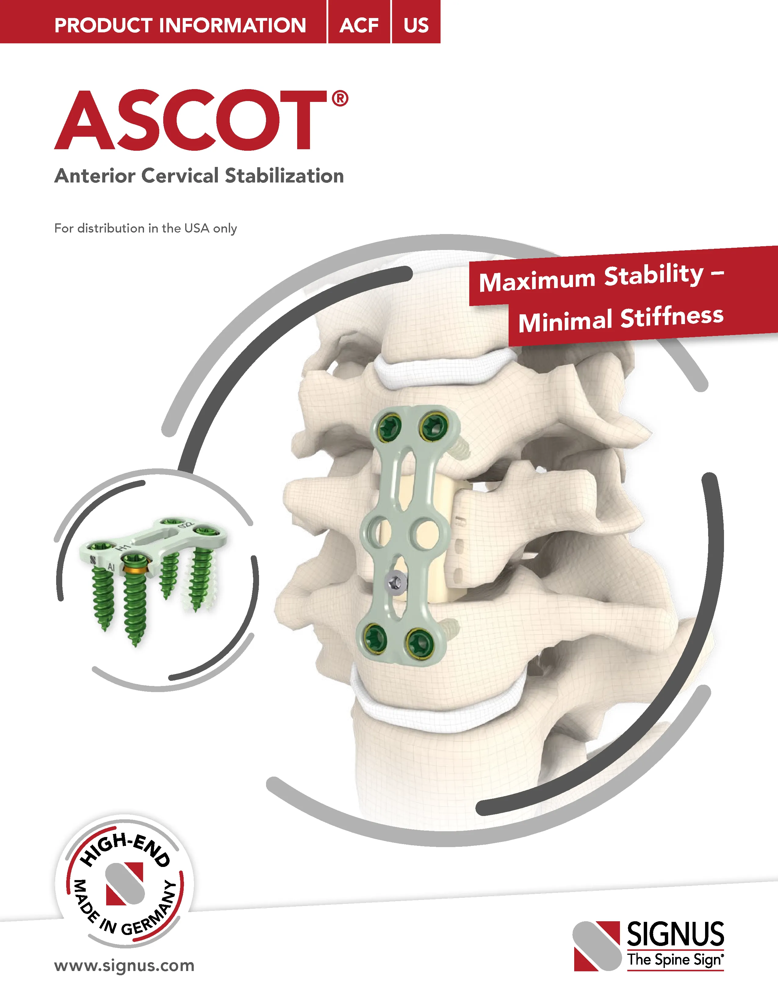The ASCOT anterior cervical plate by Signus is made of biocompatible titanium alloy and designed for ventral stabilization of the cervical spine. The plate is low profile at 1.8 mm thick, has a pre-lordosed semi-rigid design with large angle variability, and has an efficient single step integrated locking mechanism. Screws are available in self-drilling, self-tapping, and variable- and fixed-angle options. Additionally, graft screws and connector screws can be inserted through the plate to attach to bone graft or interbody/VBR implant to ensure a secure construct.