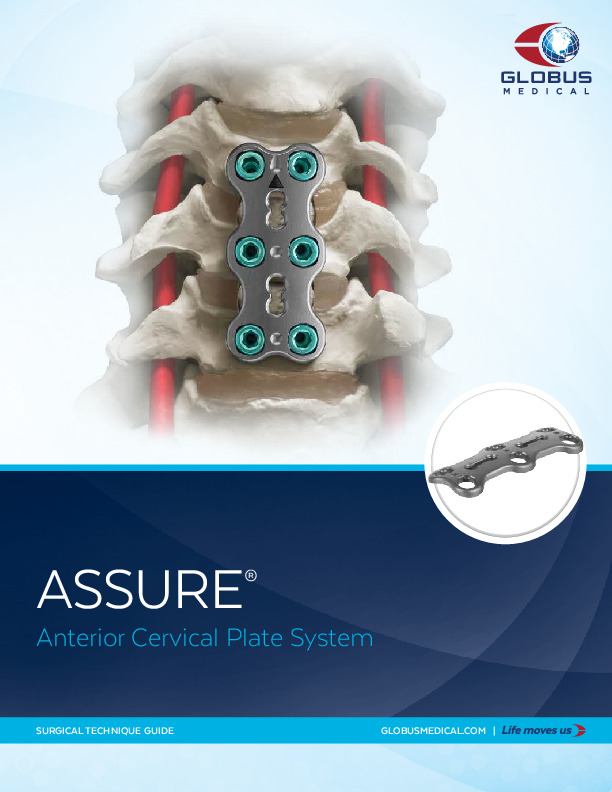 ASSURE anterior cervical plate by Globus Medical is an anterior plate and screw solution for the anterior cervical spine that features automatic locking for screws. Comes in a translating version as well for dynamic motion.