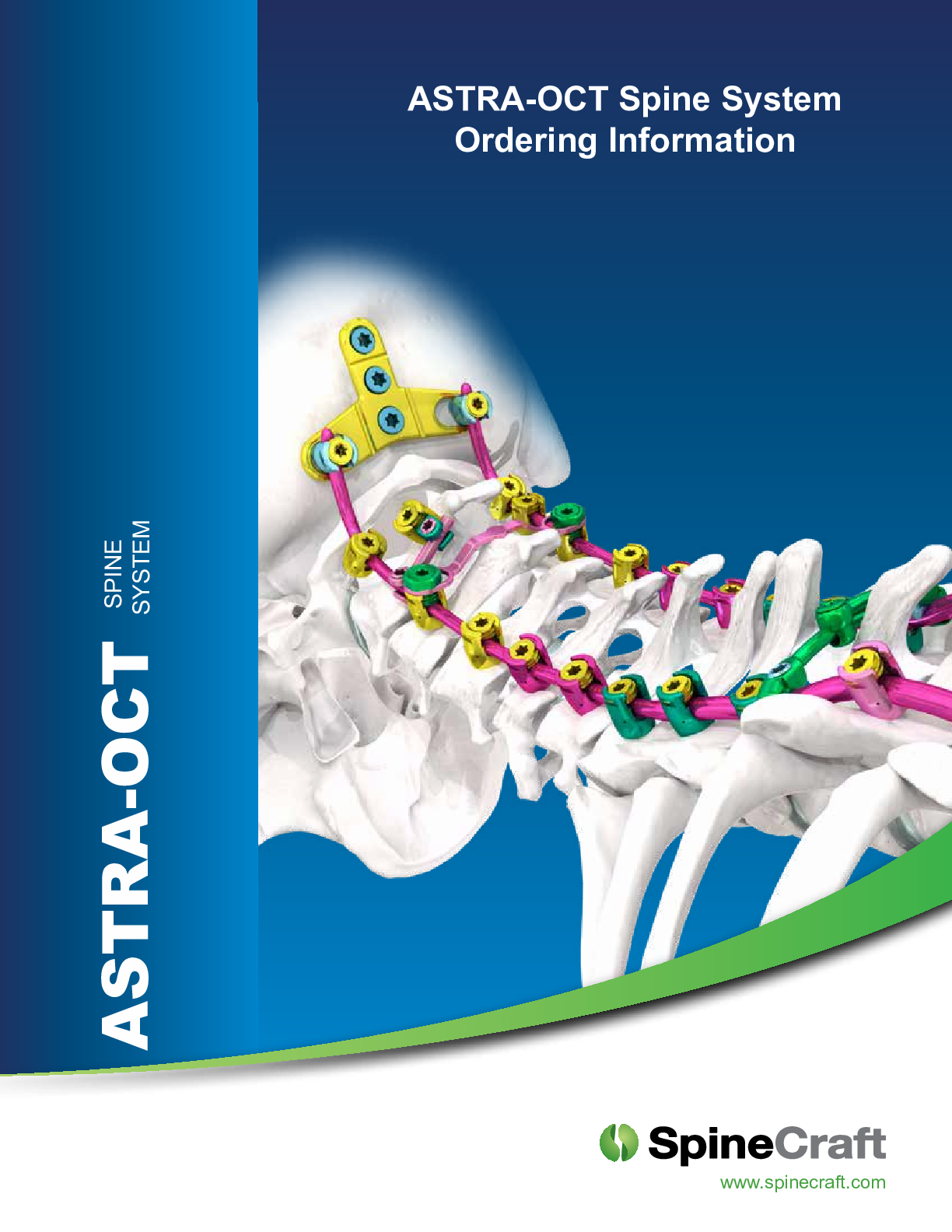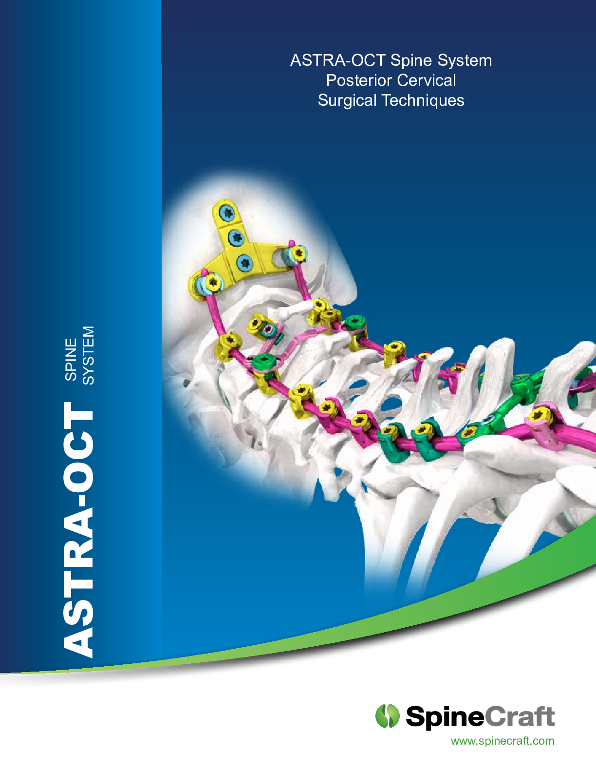 ASTRA-OCT by SpineCraft is a posterior cervical spine fixation system that features a low-profile screw head design with +70 degrees of conical angulation. All variable angle screws are dual favored, with medial-lateral and cranial-caudal favored angle. Reduction screws available. Two rod diameters offered in titanium and cobalt chrome, also available in speciality Z-shaped and transition rods. Connection options include revision rods, offset and lateral connectors, laminar hooks, screw-to-screw, and rod-to-rod connectors. Occiptial implants include plates, occiptial bone screws, and occipital angled rods. This system seamlessly interfaces with ASTRA Spine System for occiput to pelvis fixation.