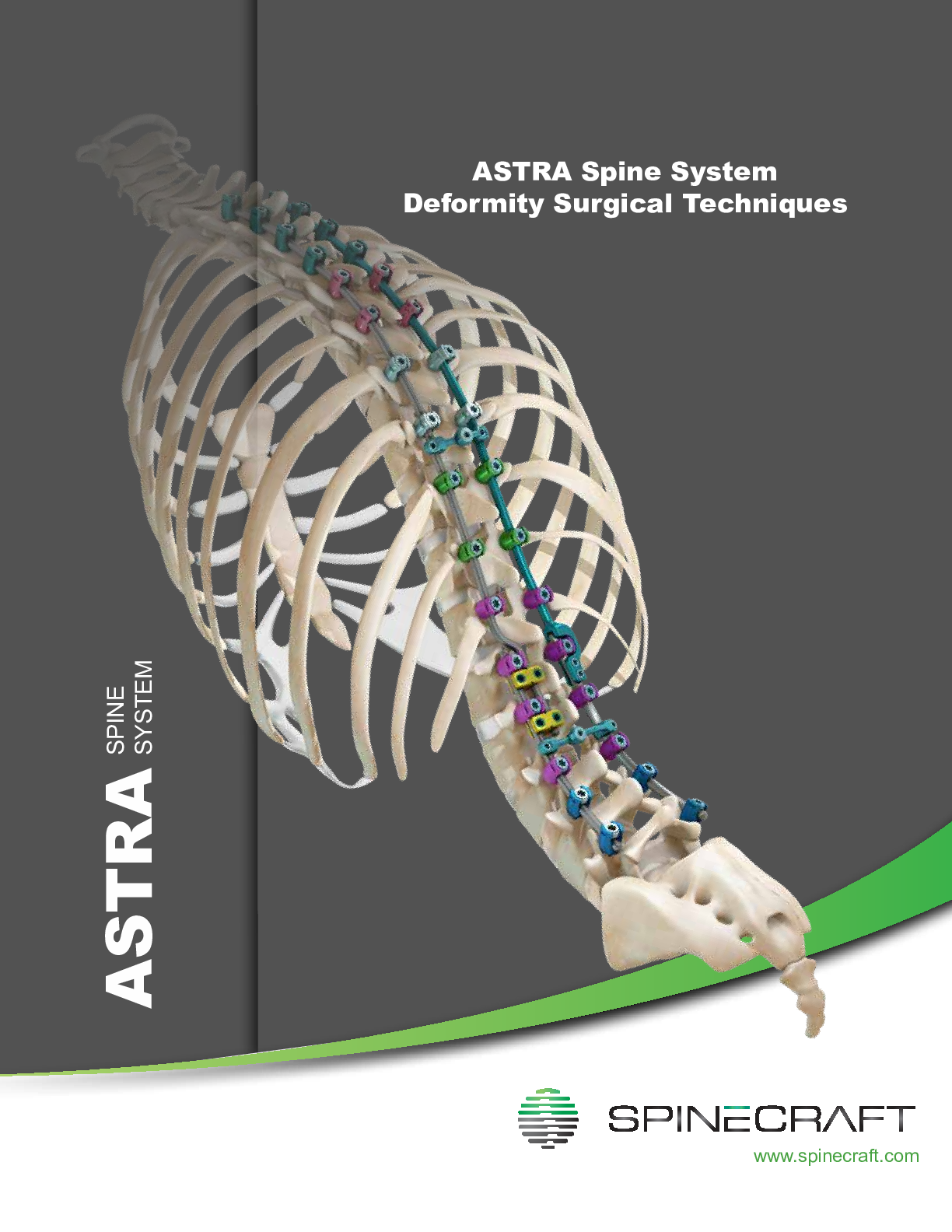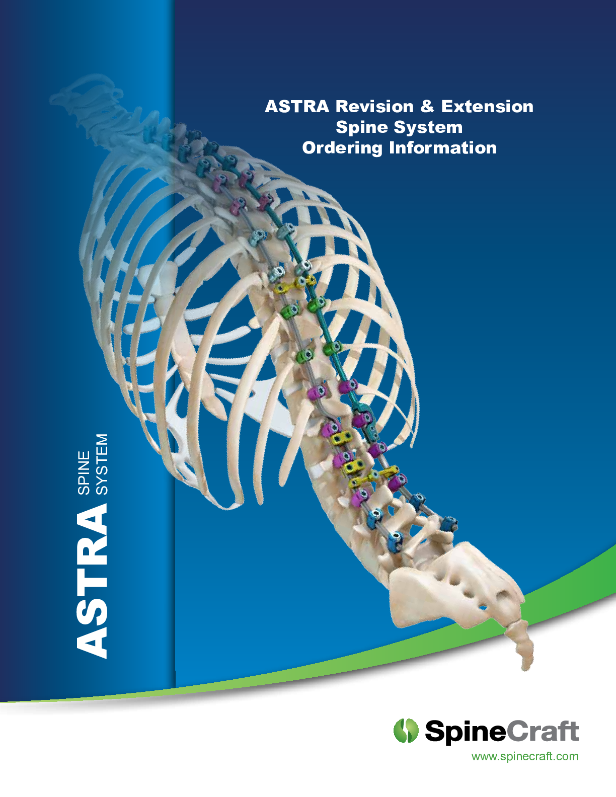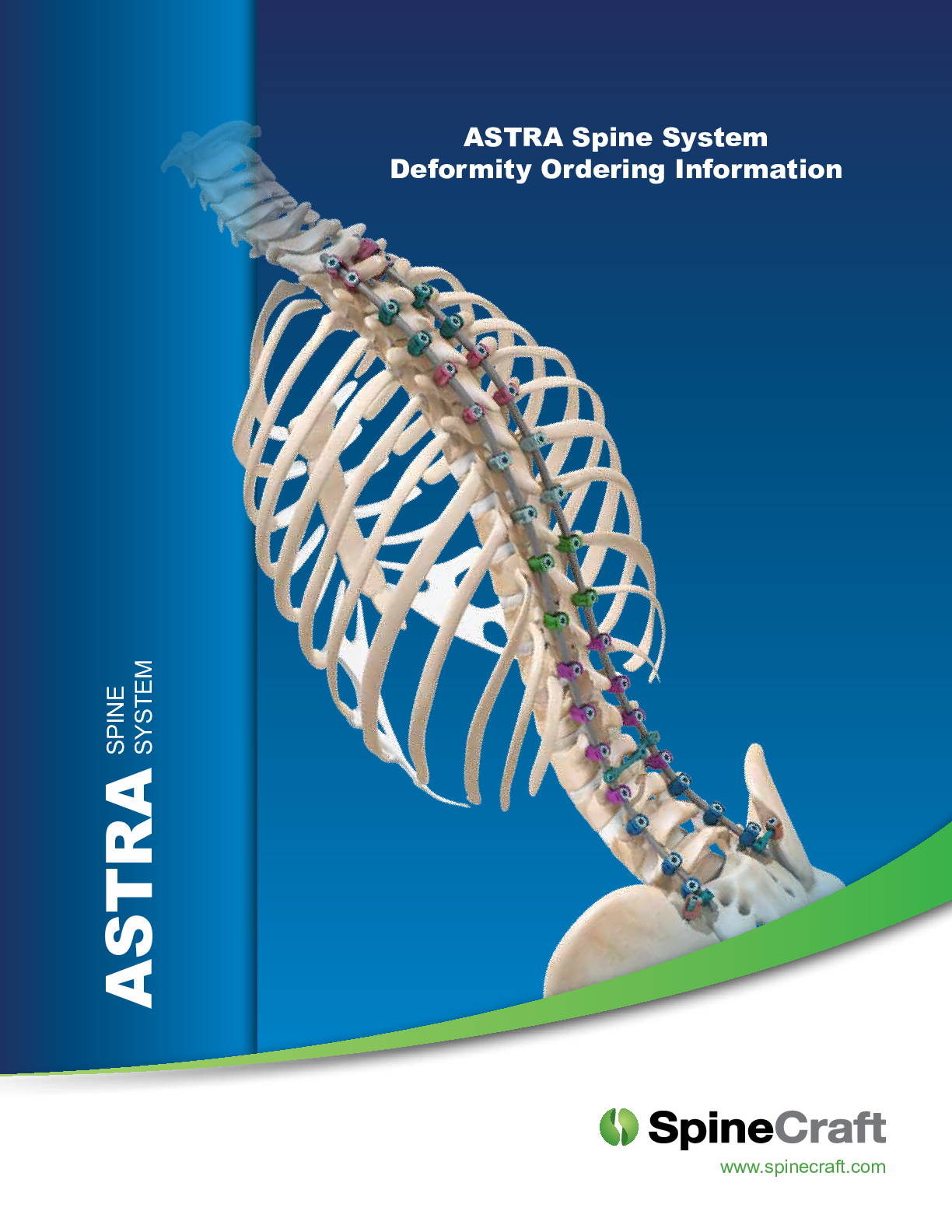 ASTRA by SpineCraft is a comprehensive deformity, degenerative, and revision spine system designed for integrated, navigation-ready, thoracic to pelvis fixation. All screws are titanium with double-lead threads, OsteoHold screw technology, dual core technology, are self-tapping, and polyaxial screws have a friction-fit head. Uniplanar, fenestrated, reduction, revision, and high angulation solid or cannulated S2AI screws available. Multiple rod diameters available in titanium alloy or cobalt chrome. Additional implant options include C-blockers, laminar hooks, transverse process hooks, offset hooks, bifid hooks, reduction hooks, cross-connectors, rod-to-rod, iliac, and ASTRA in-line connectors, and differentiated Z-rod connectors.