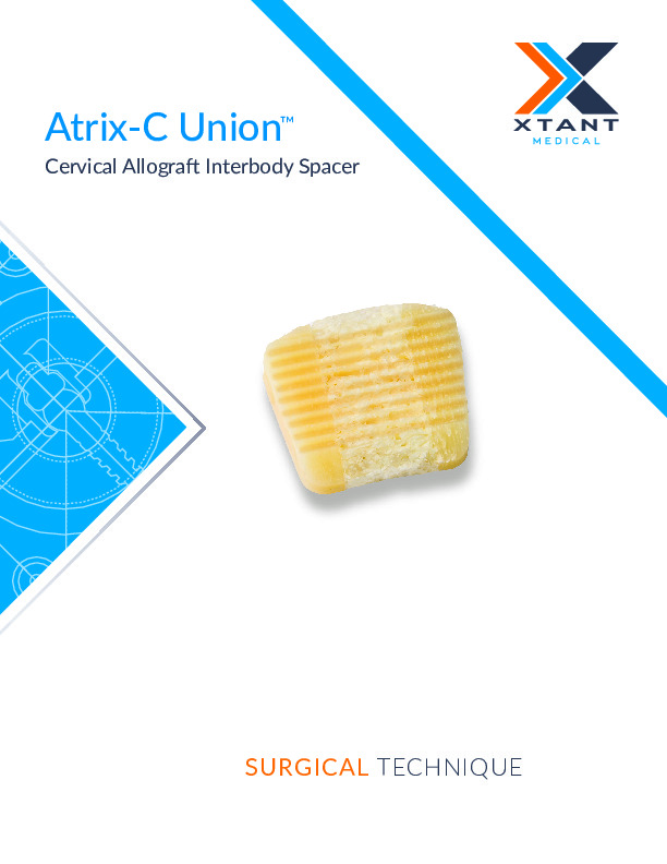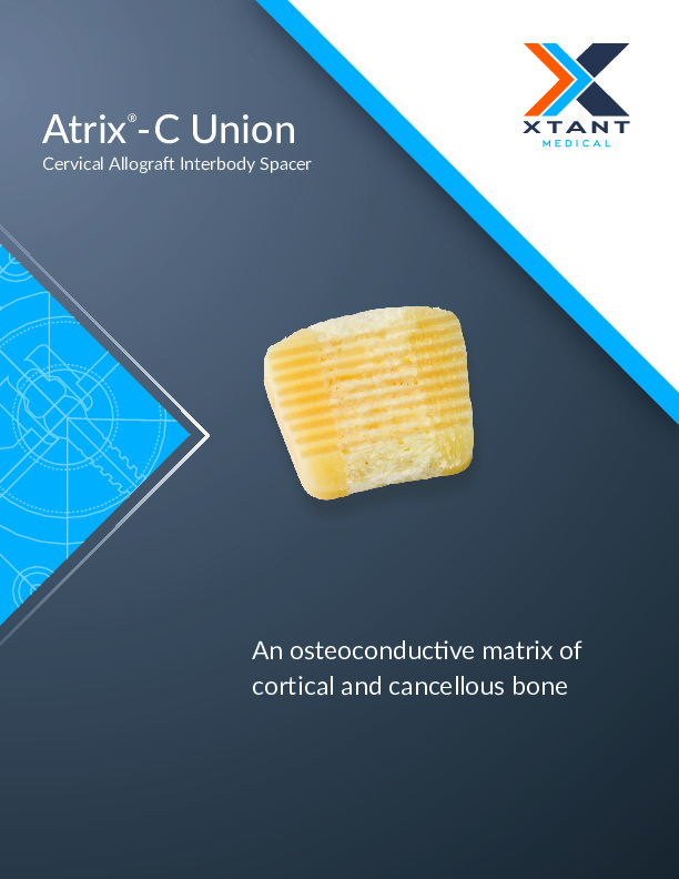 The Atrix -C Union is a cervical allograft interbody spacer for use in the ACDF procedure and is composed of a combination of cortical outer and a cancellous inner portion. Atrix -C Union is available as a 7 degree lordotic spacer with 2 footprint options.