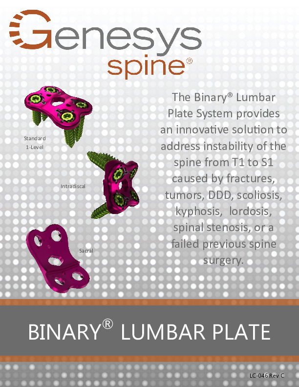 The Binary Lumbar Plate System by Genesys Spine is a versatile system for use from T1-S1 and indicated for procedures including degenerative, trauma, oncology, revision surgery.