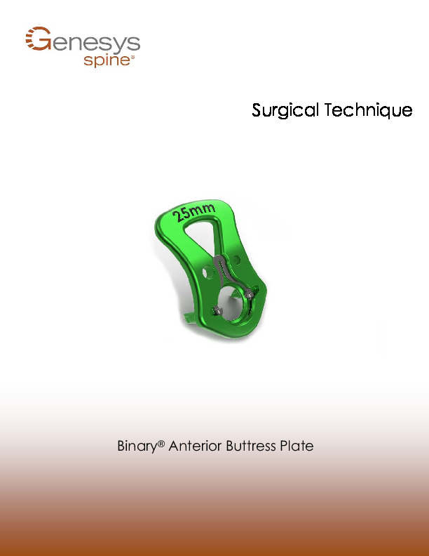 The Binary Anterior Buttress Plate by Genesys Spine is a versatile minimal footprint buttress plate for use in the lumbar spine and can be used in most approaches. It features a zero-step locking screw with anti-rotation mechanism once locked.