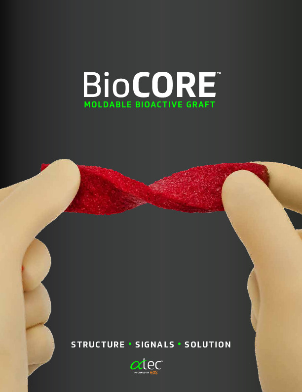 The BioCORE is a moldable bioactive glass strip composed of Carbonate apatite, bioactive glass, and type I collagen. Can be hydrated with BMA for delivery of osteogenic cells.