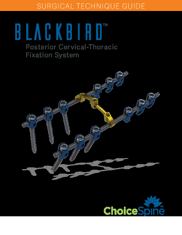 The BLACKBIRD Posterior cervical-thoracic fixation system by Choice Spine is a comprehensive system for fusions in the cervical and upper (T3) thoracic spine. It features a complete set of high-angulation polyaxials heads in both full-thread and partial thread options.