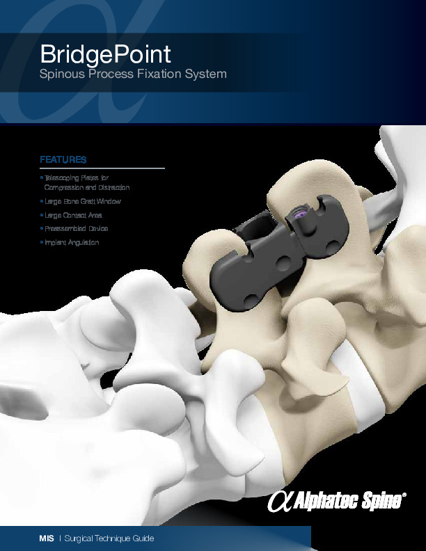 The BridgePoint Interspinous process fixation device is a less invasive option for spinous fixation than traditional pedicle screws. It is intended to be used with adjunctive stabilization measures of the thoracic, lumbar and sacral levels. May be used with ALIF, TLIF, PLIF, XLIF, lateral fusion.