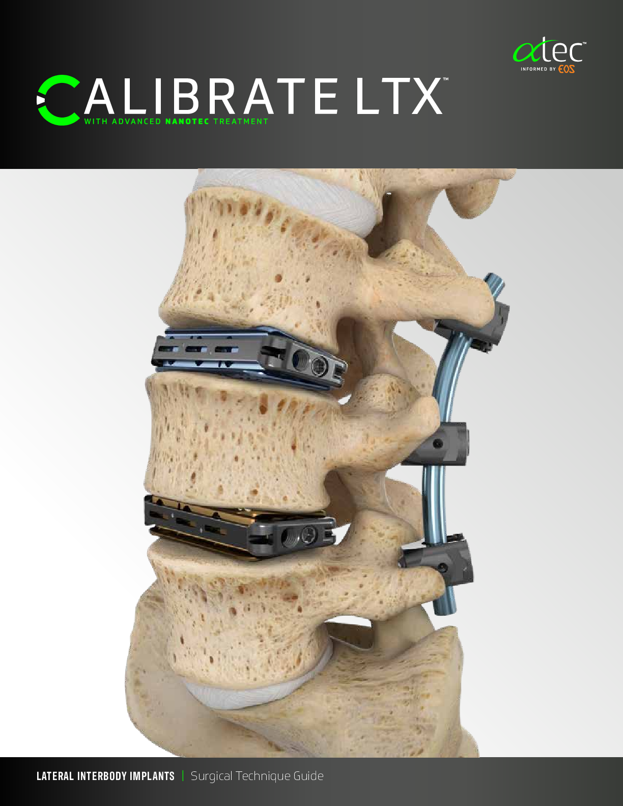 The Calibrate LTX by ATec is an expandable lateral lumbar interbody spacer for use in the LLIF procedure. It features progressive lordotic expansion with multiple lordosis options and width options. NanoTec surface treatment with HA coating provides added grip and increased bony on-growth for faster bony adhesion. Can be used with modular lateral AMP LTX plating system