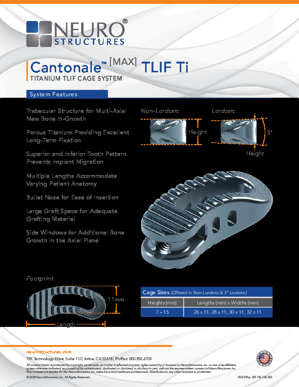 The Cantonale[MAX] TLIF interbody spacer designed by NeuroStructures/NuGen, consists of porous titanium in a trabecular structure to promote multi-axial bone ingrowth and increase long-term fixation. The bulleted nose is for ease of insertion, superior and inferior tooth pattern to prevent migration, and is available in multiple lengths to accommodate varying patient anatomy.