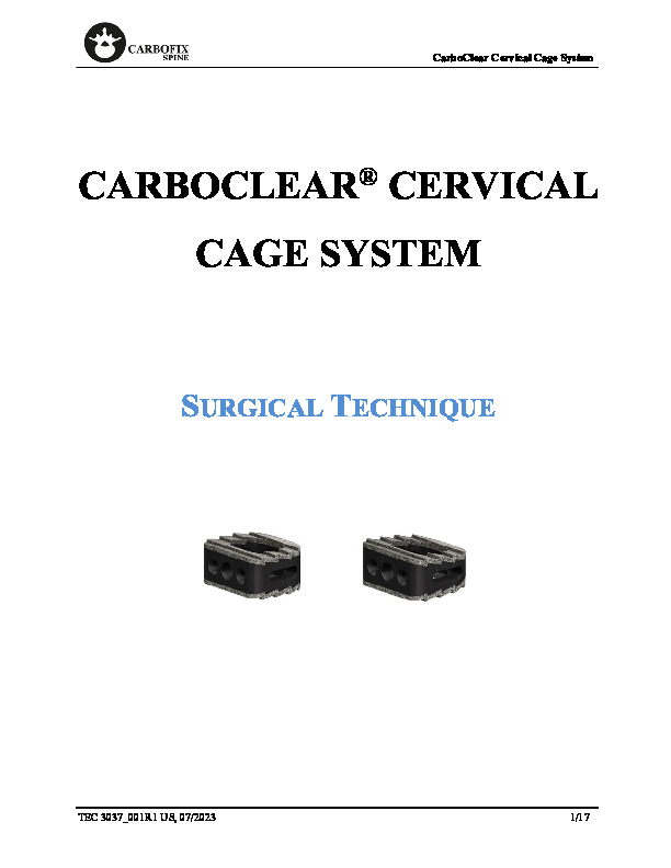 The CarboClear Anterior Cervical Spacer by CarboFix is a carbon fiber reinforced PEEK (CFR-PEEK) spacer for use in the ACDF procedure and features high strength material with porous 3D printed titanium endplates for increased bony adherence and ingrowth. Optimal for use when future imaging is required such as degenerative, oncology or trauma.