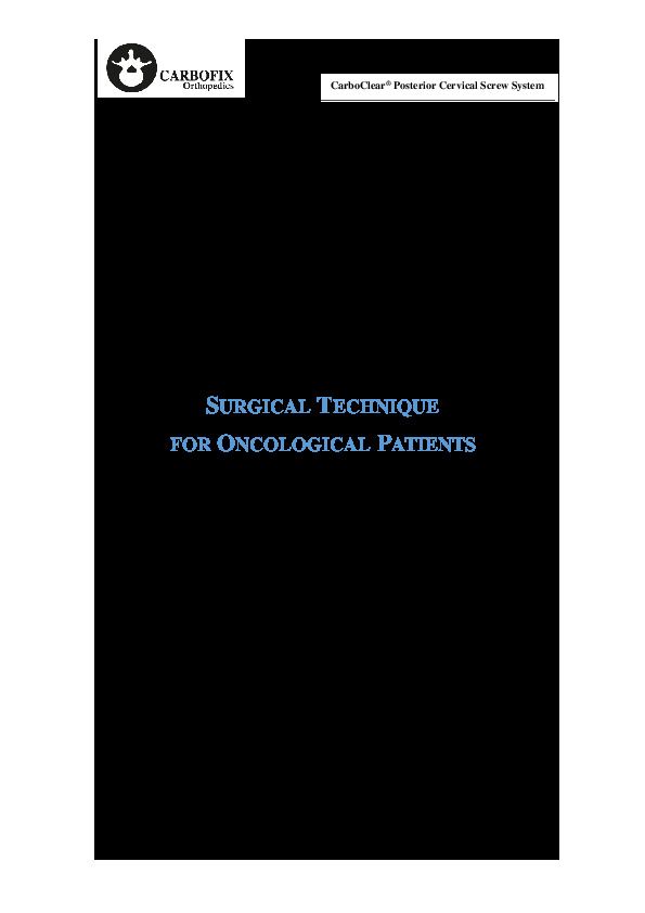 The CarboClear Posterior Cervical Screw System by CarboFix is a carbon fiber reinforced PEEK (CFR-PEEK) screw system with titanium coating. CarboClear posterior Cervical is indicated for use in oncology cases. Screws feature a 60 degree conical angulation.