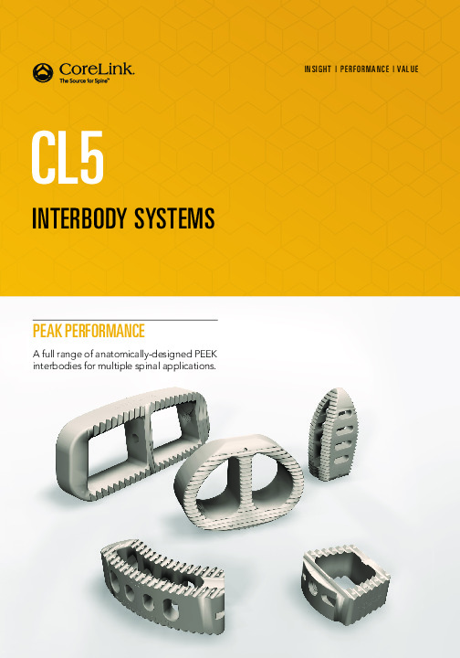 The CL5 Lateral Lumbar interbody Spacer by CoreLink (Zavation) is a PEEK material with tantalum markers featuring a trapezoidal body and multiple size offerings