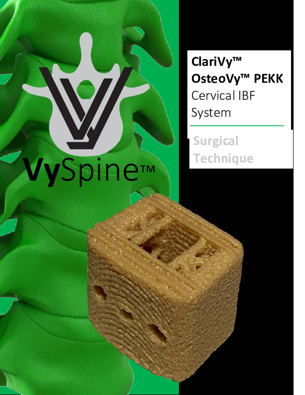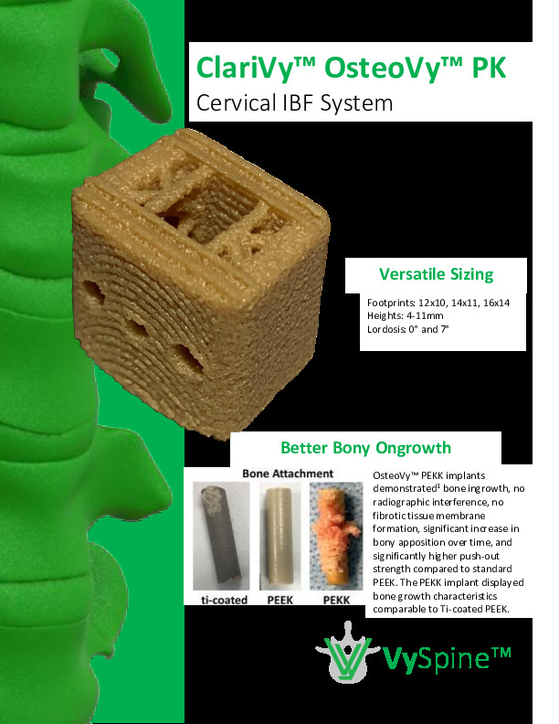 ClariVy IBF OsteoVy PEKK by VySpine is a cervical spacer designed for single level fusion in the anterior cervical spine. OsteoVy PEKK is manufactured from biocompatible OXPEKK polymer and demonstrates enhanced osseointegration, better bony ongrowth, improved bone density, anti-microbial properties, and hydrophilicity. The implant has anti-migration teeth on superior and inferior surfaces, and integrated porous lattice structure, and has imbedded radiographic tantalum markers. This implant is intended for use with supplemental fixation.