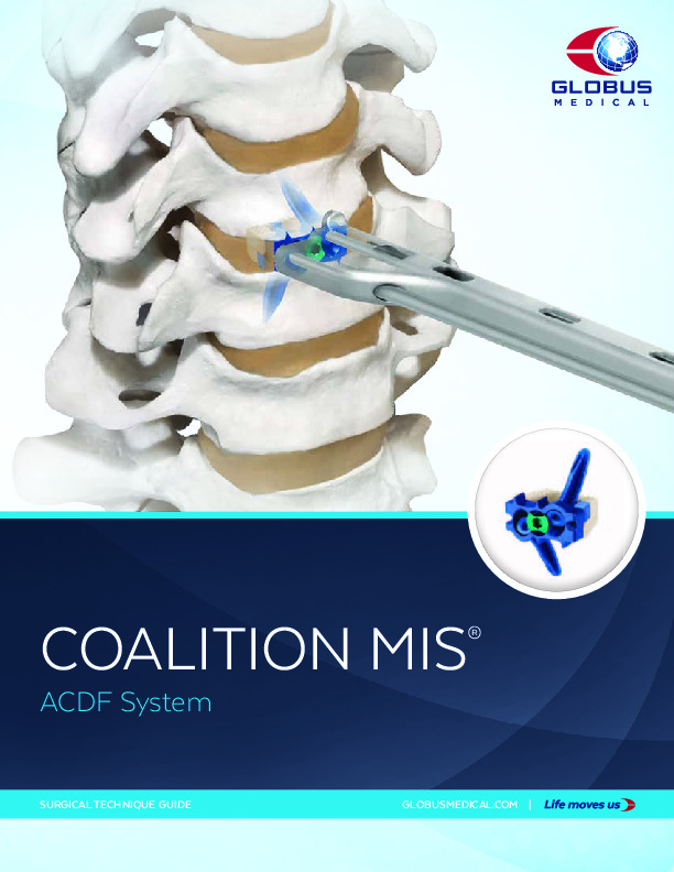 The COALITION MIS is a titanium cervical ACDF cage and utilizes an integrated anchor fixation system allowing implantation of the spacer through smaller corridors. The spacer can be used with the MIS anchor or traditional screw fixation.