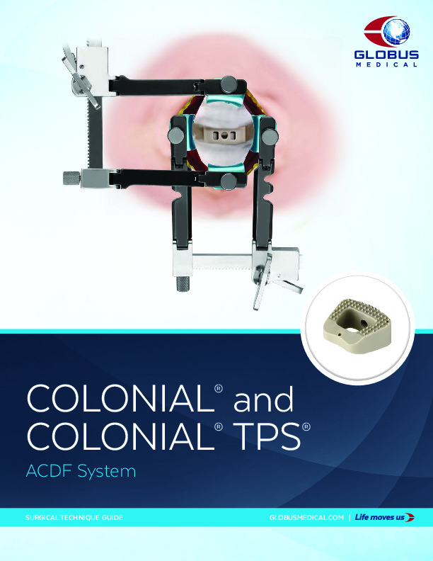 COLONIAL™ Spacer by Globus Medical is available in PEEK and a titanium plasma spray coated PEEK (TPS) spacer for use in the ACDF procedure. This is radiolucent spacer requiring supplemental fixation