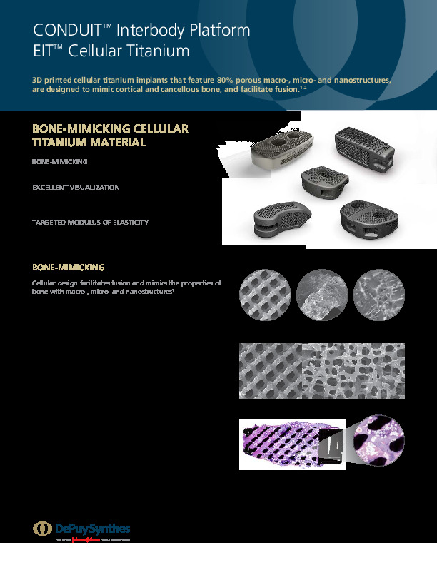 The CONDUIT EIT Cellular ACDF spacer by DePuy-Synthes is a 3D printed titanium with surface roughened microstructure that improves cellular adherence and improved bony ingrowth. The cellular appearance of the lattice structure allow for in-growth of bone for faster fusion.
