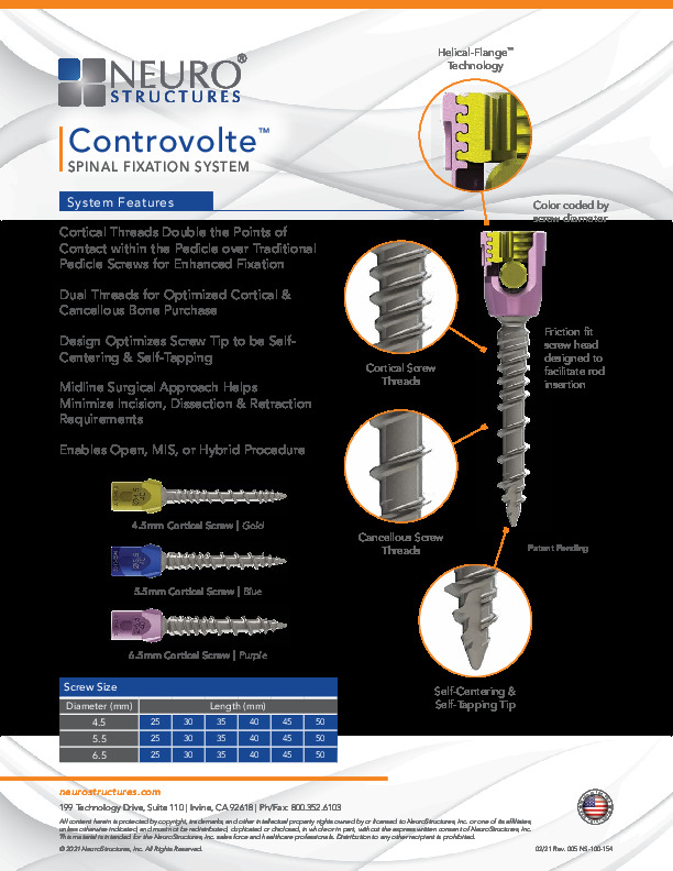 Controvolte by NeuroStructures/NuGen, is a posterior thoracolumbar spinal fixation system created for midline approach in open, MIS, or hybrid procedures. Screw design incorporates a dual thread for optimized cortical and cancellous bone purchase, with cortical threads that double the points of contact within the pedicle for enhanced fixation (over a traditional pedicle screw). The screw tip is also self-centering and self-tapping.