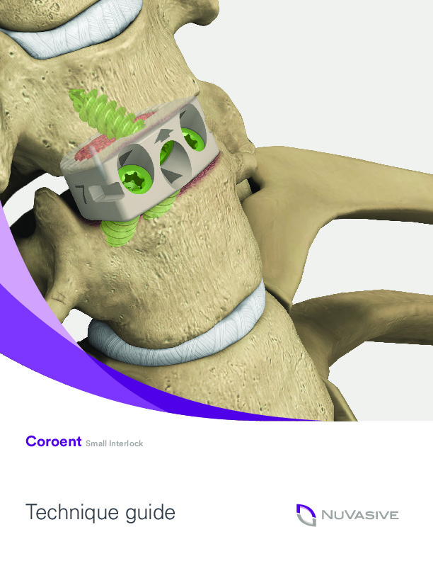 The CoRoent Small Interlock PEEK ACDF spacer is a no-profile intervertebral implant designed for reduced surgical exposure, minimal number of implants, and simplified implantation procedure. The circumferential locking ledge with visible triangle laser marks within the screw hole provide both tactile and visual confirmation of the locking mechanism.