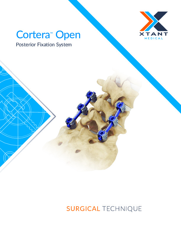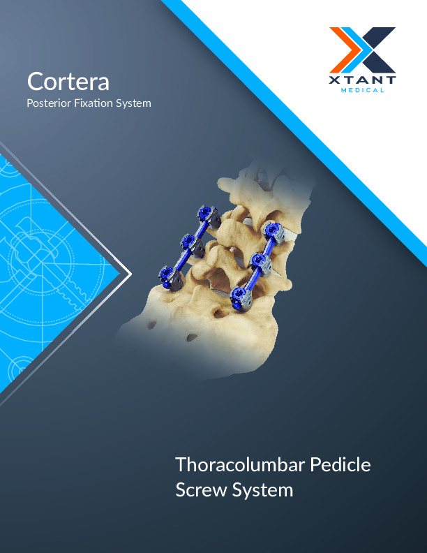 The Cortera Posterior Thoracolumbar Spinal fixation system by XTANT Medical is a comprehensive pedicle screw system utilizing a 5.5/6.0 mm rod system. Cortera features a dual-lead and quad-lead (Cortico-cancellous) Screws.