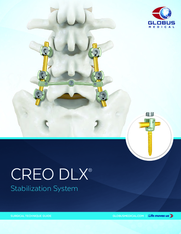 The CREO DLX by Globus Medical is a large diameter rod system utilizing the 6.0 and 6.35mm diameter rods. This system is primarily intended for thoracolumbar fixations where complex spinal pathologies require increased strength of the construct such as complex deformity, tumor, and trauma. The CREO DLX system also has a fenestrated screw which comes preloaded with polyaxial head.