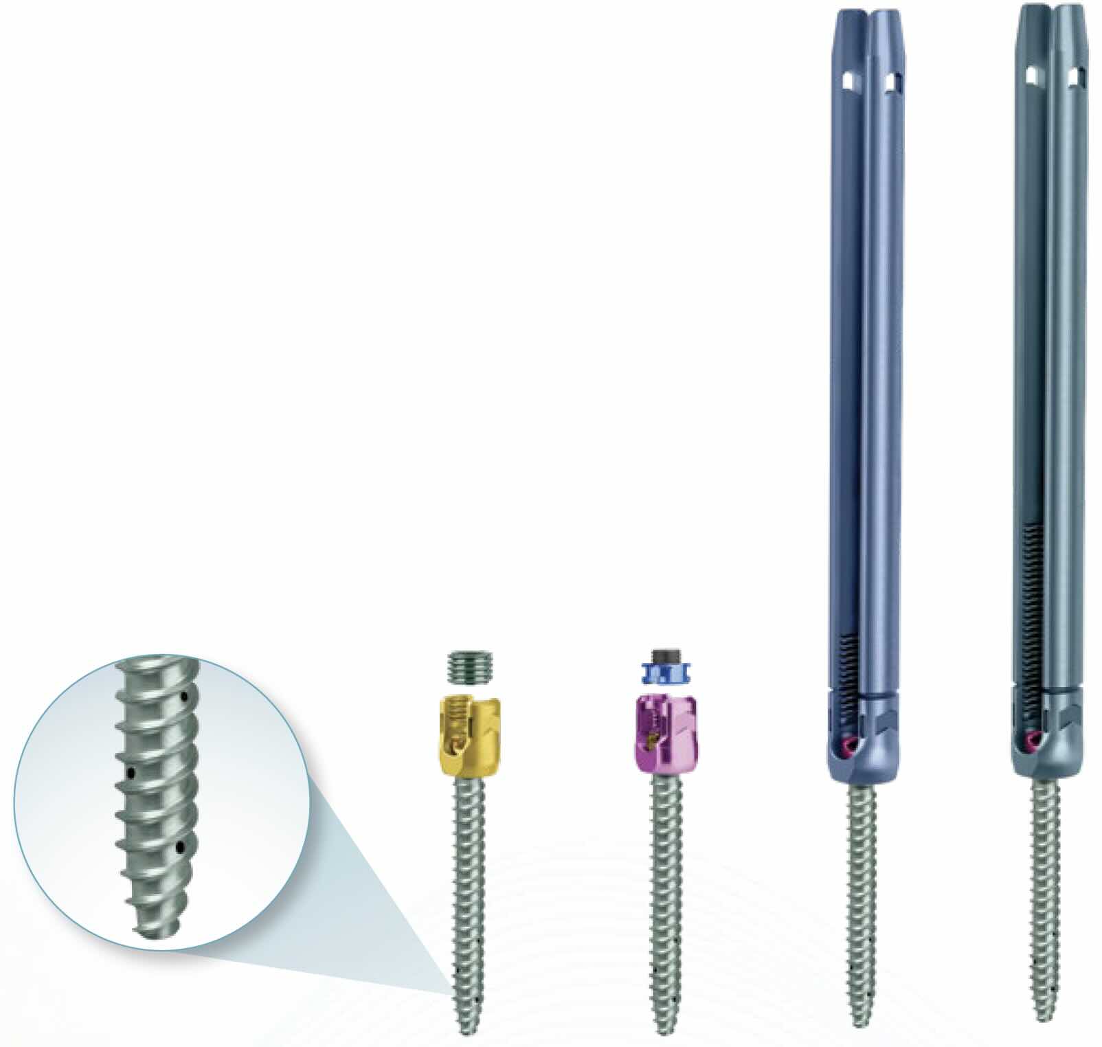Features: Fenestrated , Detachable/ Modular Head , K-Wire Cannulated , Polyaxial Head , Percutaneous Screw , Extended Reduction Head Tabs