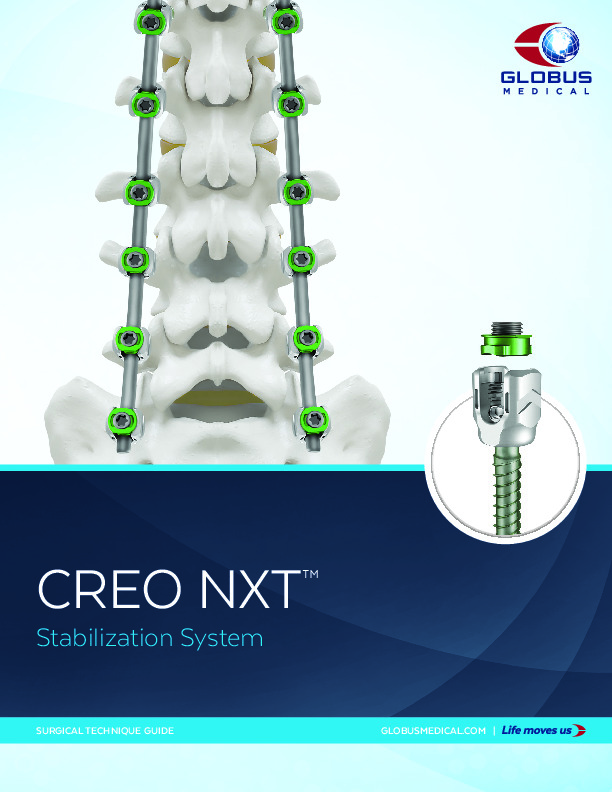 The CREO NXT is a high-strength CoCr deformity correction system that is designed to withstand the high load stresses involved in deformity. It features a non-modular head system that accepts both 5.5 and 6.0mm rod systems. It also features a non-threaded head to eliminate cross threading.