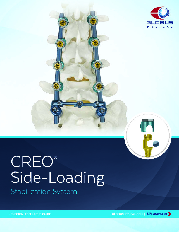 The CREO Side Loading Pedicle Screw stabilization system by Globus Medical is a non modular polyaxial screw fixation system with a lateral capture of the rod. The locking sleeve captured and hold the rod in place before final tightening. The system comes with multiple screw options