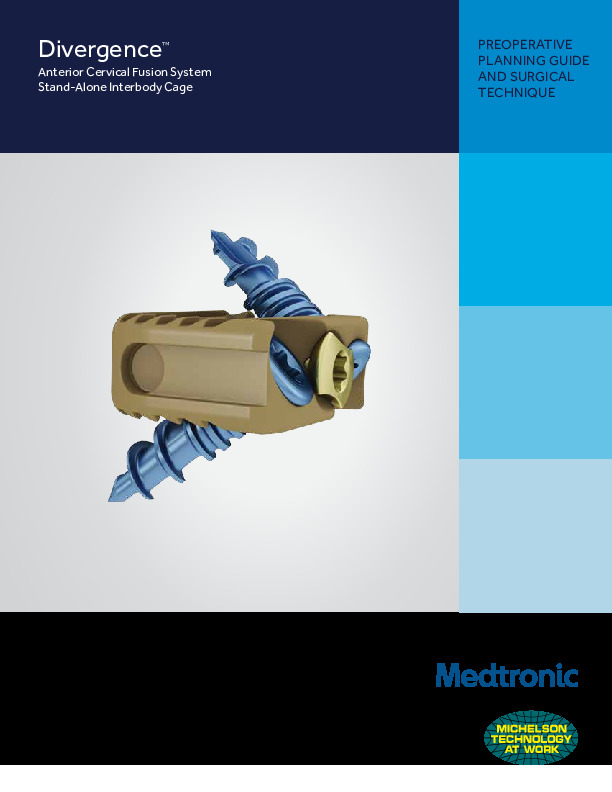 The Divergence Anterior cervical standalone ACDF spacer with integrated screw fixation by Medtronic. This is a 0-profile standalone ACDF spacer that can be used as standalone or with supplemental fixation. The cage is PEEK with an anterior locking cap to prevent screw back out.
