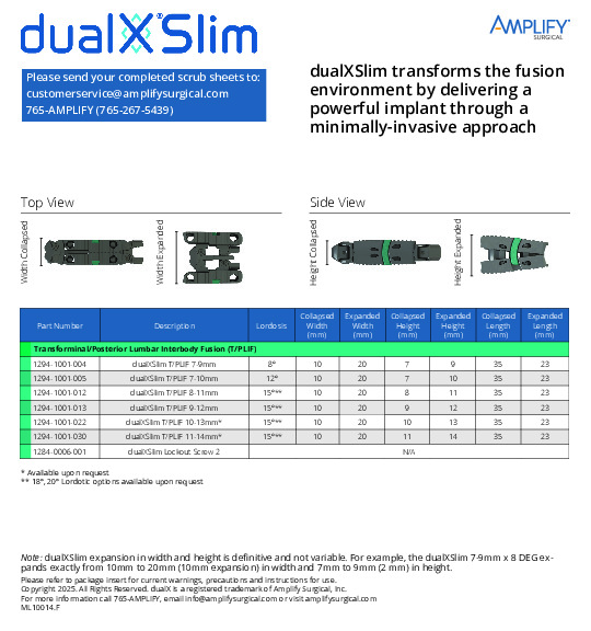 The dualX Slim is a Bi-directional expandable interbody spacer with the smallest insertional footprint. The implant is intended to be inserted via a TLIF approach and expands in both horizontal and vertically with progressive lordosis of 8, 12, 15, and 18 degree.
