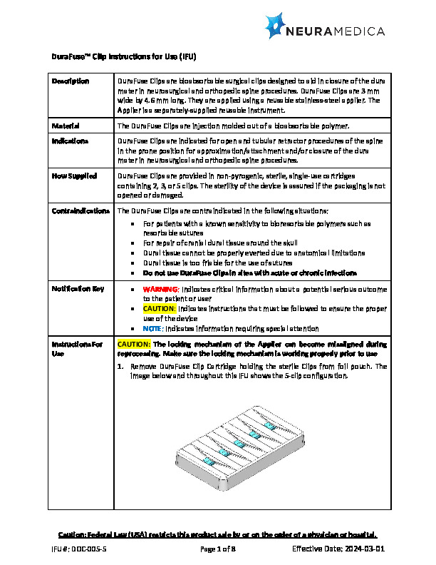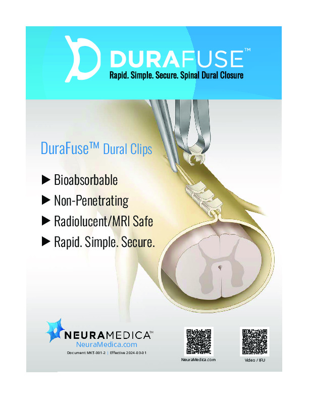 The DuraFuse Bioabsorbable Dural Closure clip by NeuraMedica is a novel dural closure device intended to expidite the process of closing the dural in open and minimal access surgery. The DuraFuse clip is injection molded from a common bioabsorbable polymer in the closed position. A reusable applier opens the clip and is placed over the everted dural edges for dural closure. Multiple clips may be used in tandem to close linear dural openings. This can be done wihtout the need for further tissue sealants or dural patches. The clips resorb within 6-8 weeks leaving no residual. The clips are radiolucent and dissolve completely leaving no trace behind.