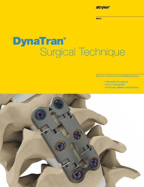 The DynaTran is a low profile dynamic ACDF plate for the cervical spine. The plate has removable clips that are removed after implant and allow up to 2mm per level.