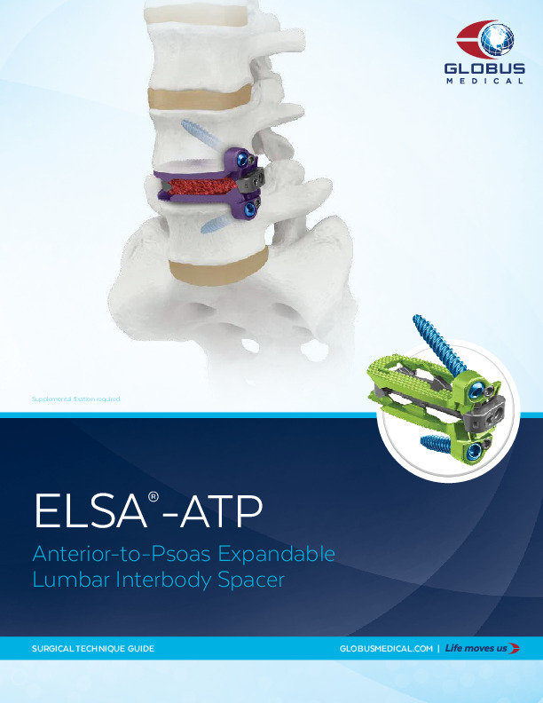 The ELSA-ATP is an integrated screw fixation expandable lateral interbody spacer for use in the Anterior-to-psoas (ATP) approach designed to help alleviate challenges associated with the iliac crest when approaching L4-5 in a lateral approach. The spacer features an angulated location of the screw fixation to accommodate the variation in approach angle.