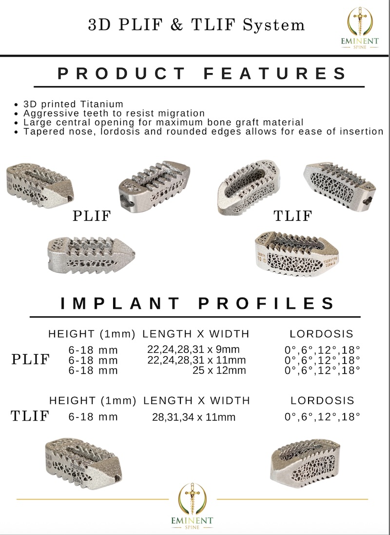 The PLIF Spacer by Eminent Spine is a family of lumbar interbody spacers intended for use in the PLIF procedure where it can be used bilaterally or in the oblique TLIF where it can be used singly oblique. If features aggressive serrations and a large central graft lumen. A bulleted nose aids in endplate distraction upon insertion. It is available in 3 material options