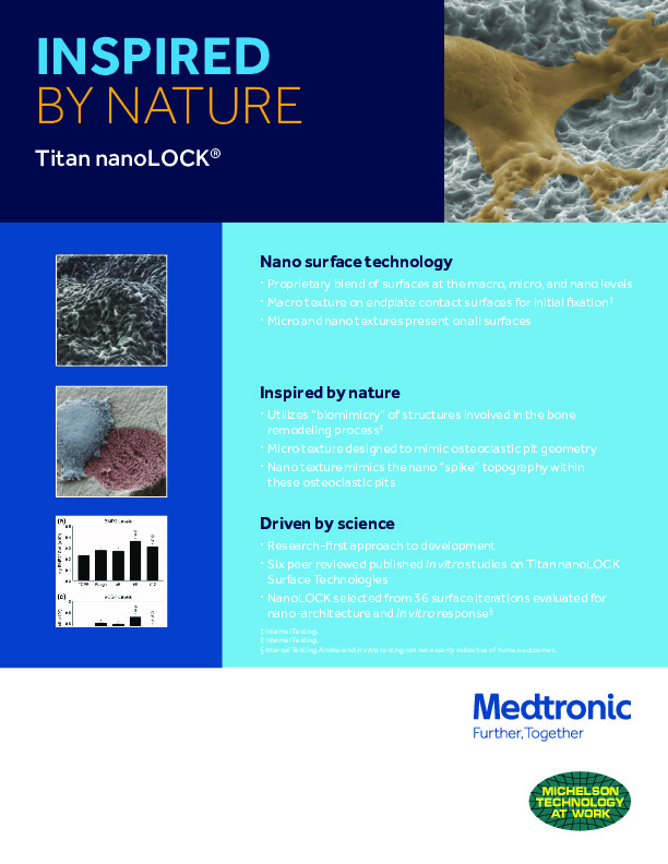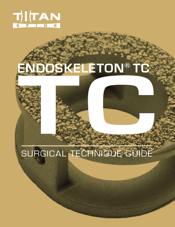 The Endoskeleton TC by Titan Spine-Medtronic is a Titanium cervical ACDF spacer with nanoLOCK etched surface treatment for increased bony adherence. The Spacer is similar to the Endoskeleton TCS which is a standalone spacer with integrated screws. The Endoskeleton TC is cage alone and requires supplemental plate fixation.