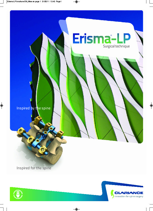 Erisma-LP Evo by Clariance is a pedicle screw system designed for posterior fixation of the thoracolumbar spine. Screws are dual-lead and are available in polyaxial, reduction, and cannulated options. Screw heads are friction fit and set screws are snap-on, increasing speed and control. Top-loading low profile cross links are articulating and adjustable in all planes. 3Z technology of the pedicle screws divides the threading into three zones: initiation zone with aggressive tip, and cancellous and cortical zones for ideal bone purchase.