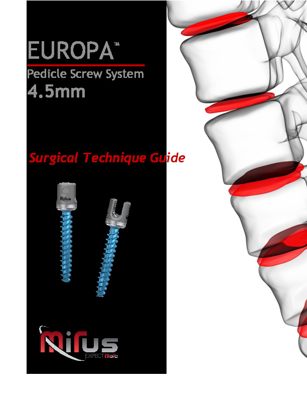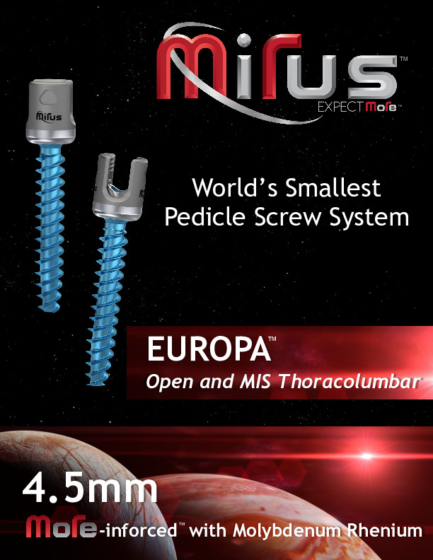 The EUROPA Thoracolumbar Pedicle Screw System by MiRus is intended for open and MIS fusion of the thoracic and lumbar spine. It features a 60 degree conical angulation.