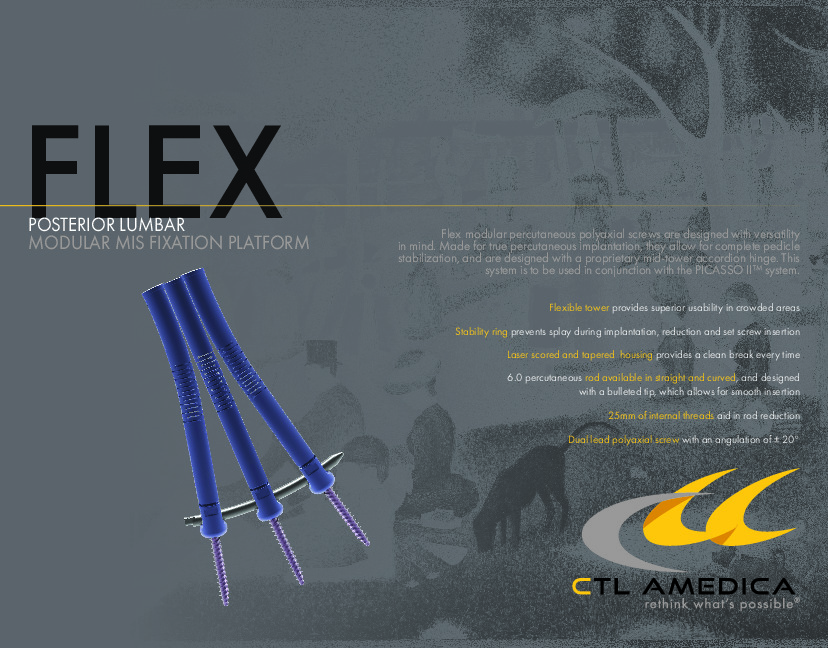 The FLEX Modular Percutaneous lumbar Pedicle Screw fixation system by CTL Amedica is a MIS percutaneous screw system build off of the PICASSO II platform and utilizes a flexible mid-tower accordion hinge to allow the use of the MIS towers in a crowded location such as the lumbosacral junction.