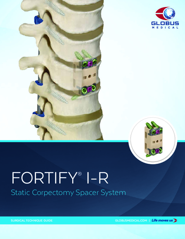 The FORTIFY I-R (Radiolucent) spacer is a static PEEK corpectomy cage that integrates built-in anterior column fixation with plate and screw fixation. Intended for use in the anterior cervical spine with an anterior approach. the radiolucent PEEK material facilitates post operative imaging.