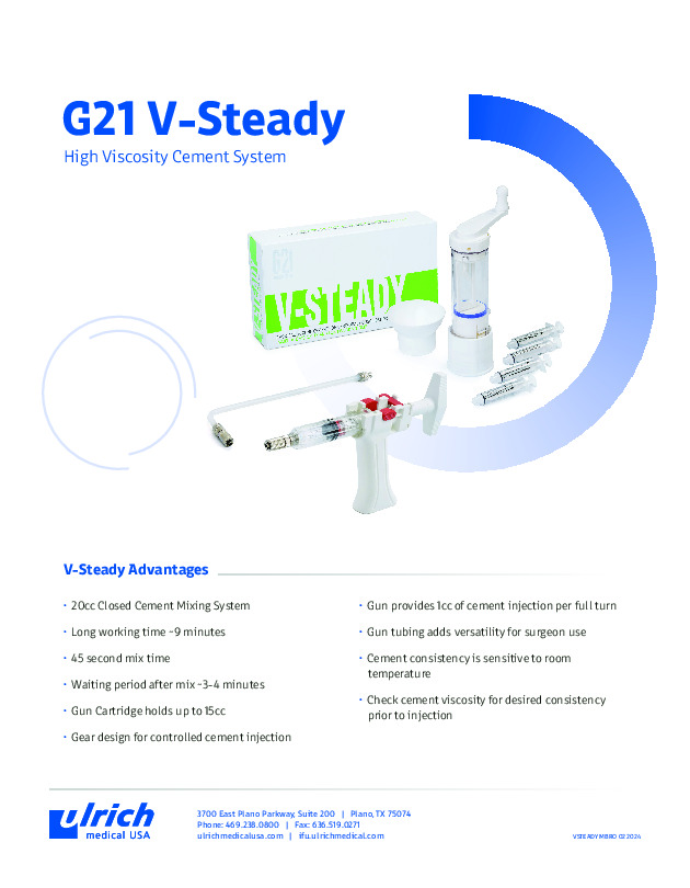 The G21 V-STEADY high viscosity cement system by Ulrich Medical USA is a closed cement mixing system with a long working time and a gear design for controlled cement injection. The cement mixes in 45 seconds, waiting period after mix of about 3-4 minutes, and then a working time of about 9 minutes.