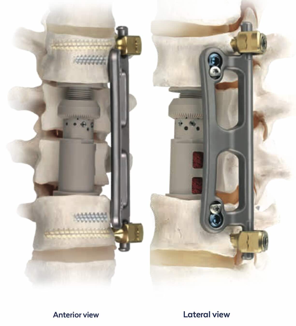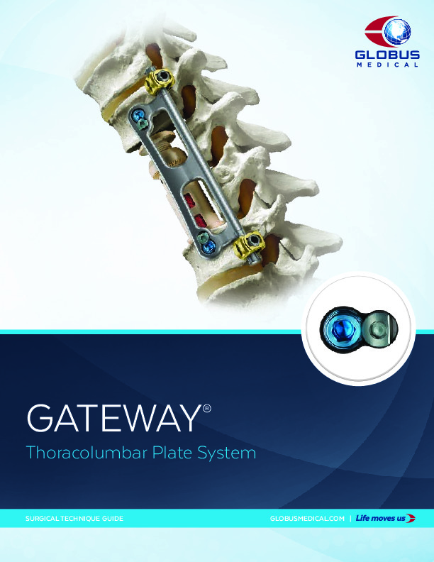 The GATEWAY lateral thoracolumbar plate by Globus Medical is a lateral corpectomy plate with fixation screws that allow the stabilization of the level while performing the corpectomy. The hinged end of the plate allows the plate to swing outward allowing you space to work and place the corpectomy cage. After final placement, the plate swings back in place distraction can be applied and locked in place with secondary screws.