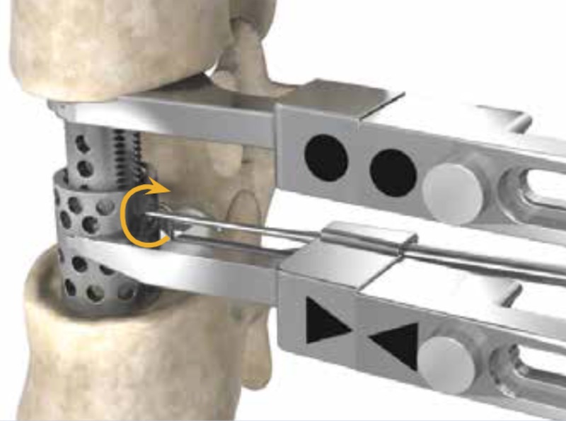 The Giza expandable thoracolumbar corpectomy spacer by Strker-K2M isa titanium implant. It comes in multiple arrangements and lordosis options with a rotatable superior endplate.