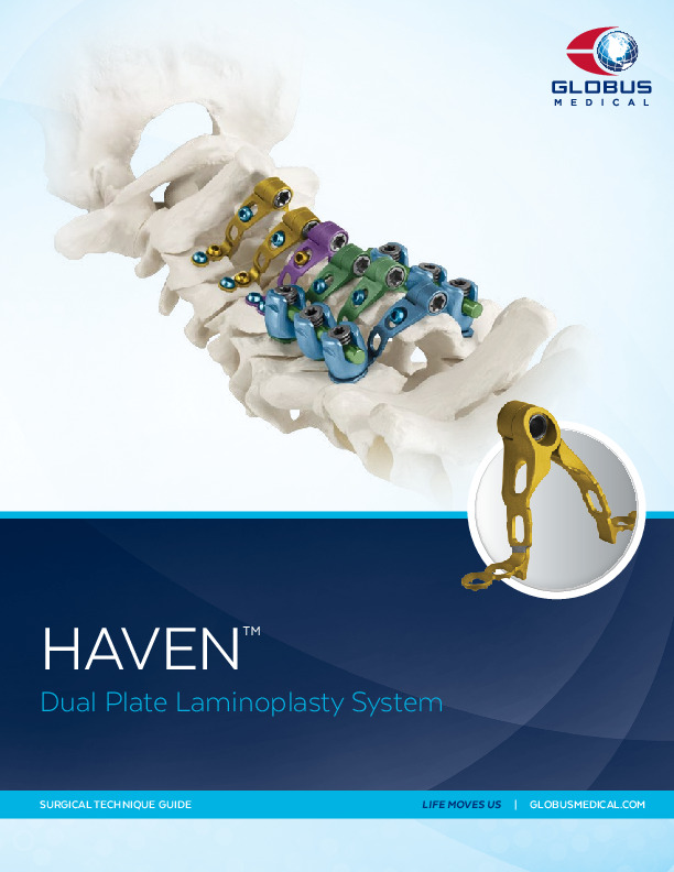 The HAVEN Laminoplasty system by Globus Medical is a dual plate system attaching to both lateral mass of the cervical spine and pars of the thoracic spine (C3-T3). The hinge mechanism bridges the posterior arch of the spine to provide stability and cord protection.