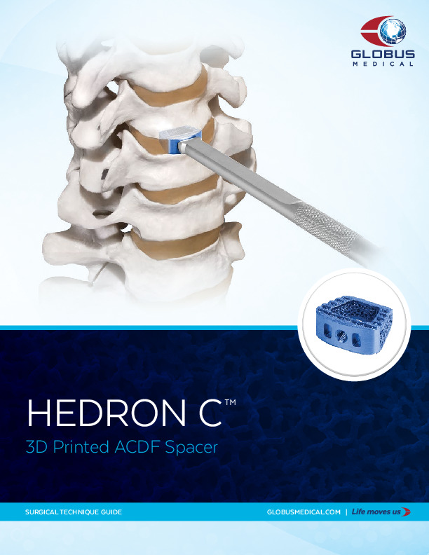 HEDRON C is a 3D printed titanium anterior cervical discectomy and fusion (ACDF) spacer interbody fusion device that features a porous scaffolding to facilitate bony ingrowth.