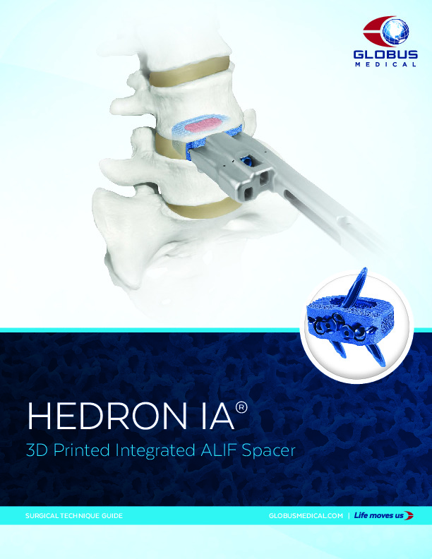 The HEDRON IA is a 3D printed titanium ALIF spacer with integrated screw or anchor holes for fixation.