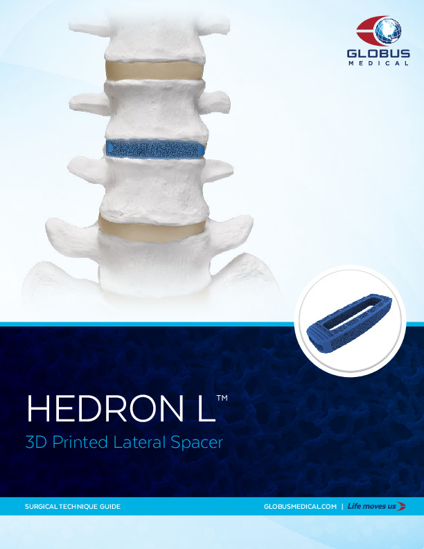 The HEDRON -L is a 3D printed titanium lateral lumbar interbody spacer for use in the XLIF/LLIF direct retroperitoneal procedure.