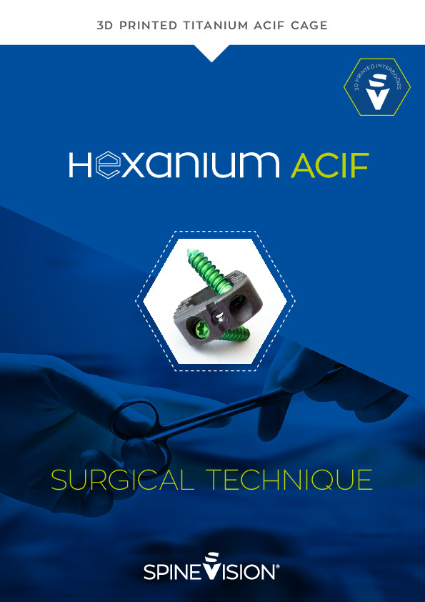 The Hexanium ACIF Cage by SpineVision is a 3D printed standalone cervical interbody fusion system made of titanium with integrated zero-profile design, one-step locking mechanism, honeycomb structure, high porosity, and osteoconductive properties for enhanced bone fusion.